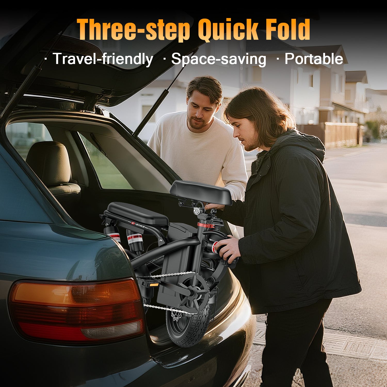 ASKGO electric bike features a <b>high-carbon steel frame</b> and a <b>high-density foam seat</b> for ultimate comfort. The folded size is approximately <b>28x19x23 inches</b> (actual measurements may vary slightly). Its foldable design makes it easy to carry and store in a car trunk, ideal for urban commuting and travel – perfect for teens, students, commuters, retirees, and beginners.<br />