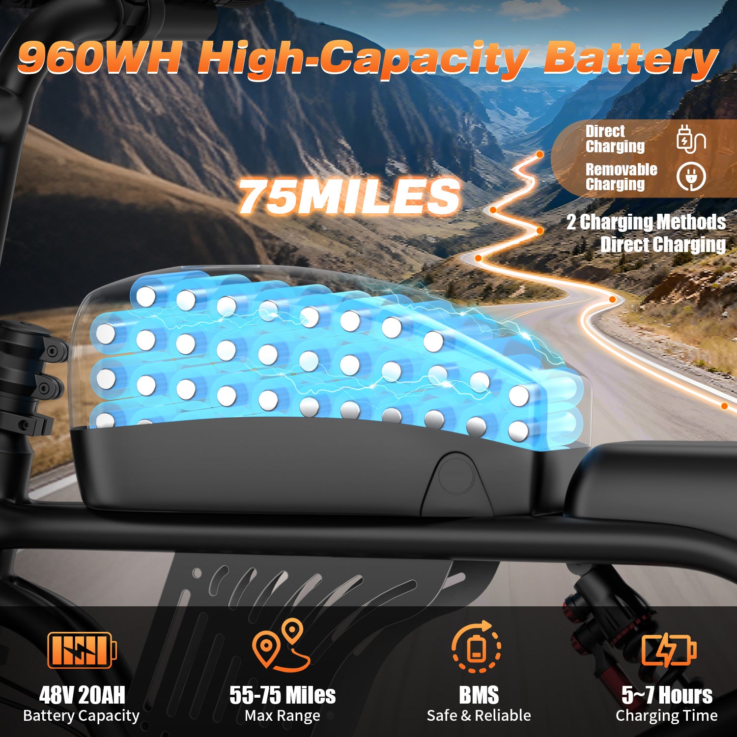🔋[48V 15Ah Removable Battery – Long-Lasting Range]: Enjoy up to 55-75 miles of ride time per charge. The removable battery makes charging simple and flexible, allowing you to power up wherever it’s most convenient for your adventures.