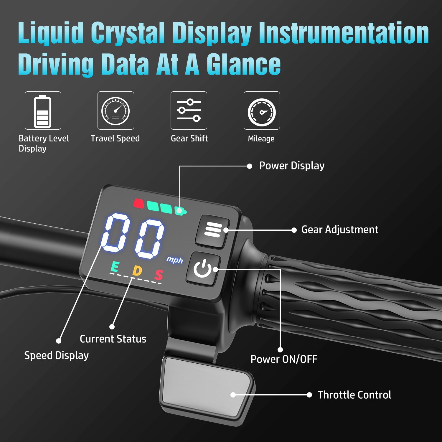 <b>HD LCD display</b> shows real-time speed, battery level, mileage, and assist mode (3 adjustable levels). Features night backlight and one-touch riding mode switching – easy for beginners to master!<br />