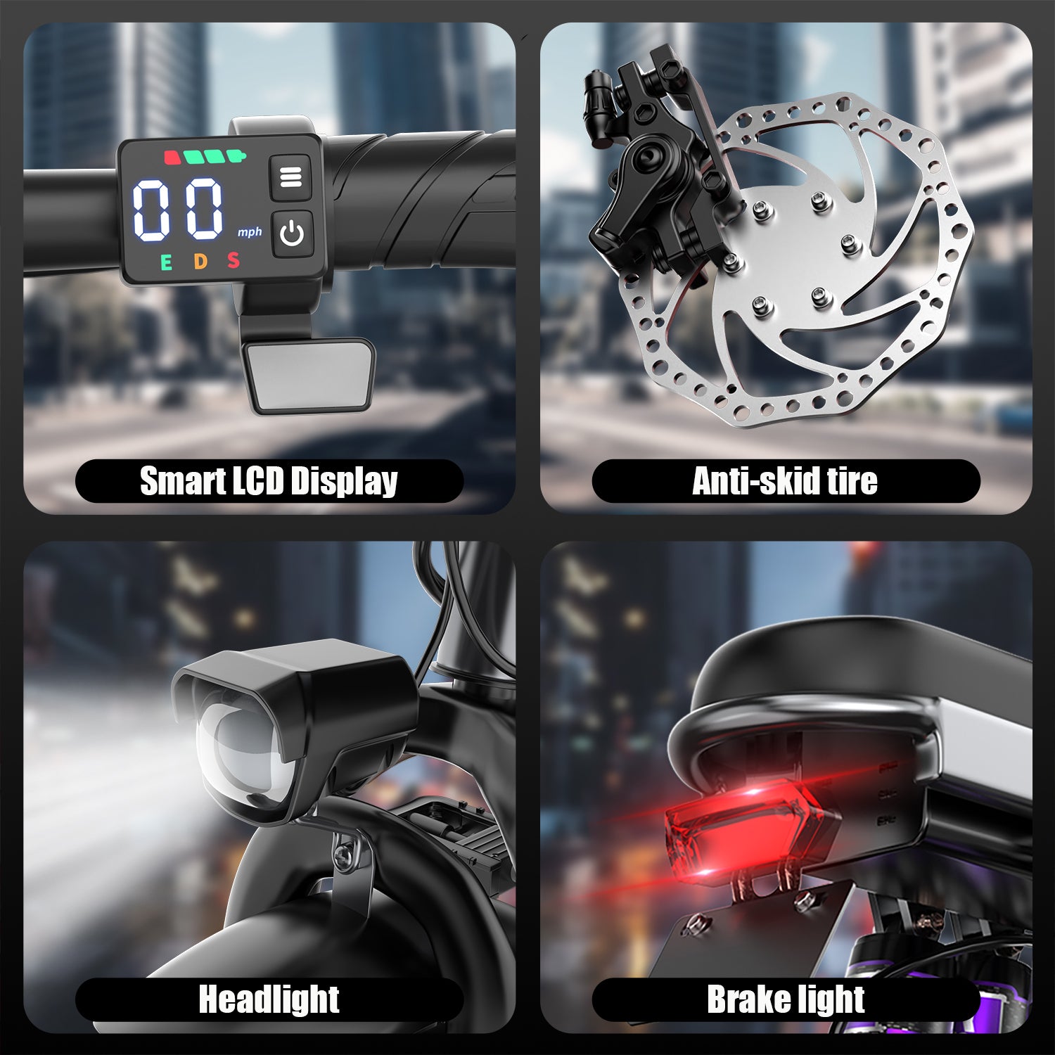 <b>Adjustable frame fits different heights</b>. Dual rear disc brakes ensure precise stopping. Shock-absorbing front fork enhances comfort. Ideal for commuting, off-roading, and camping. Tools included for easy assembly!<br />