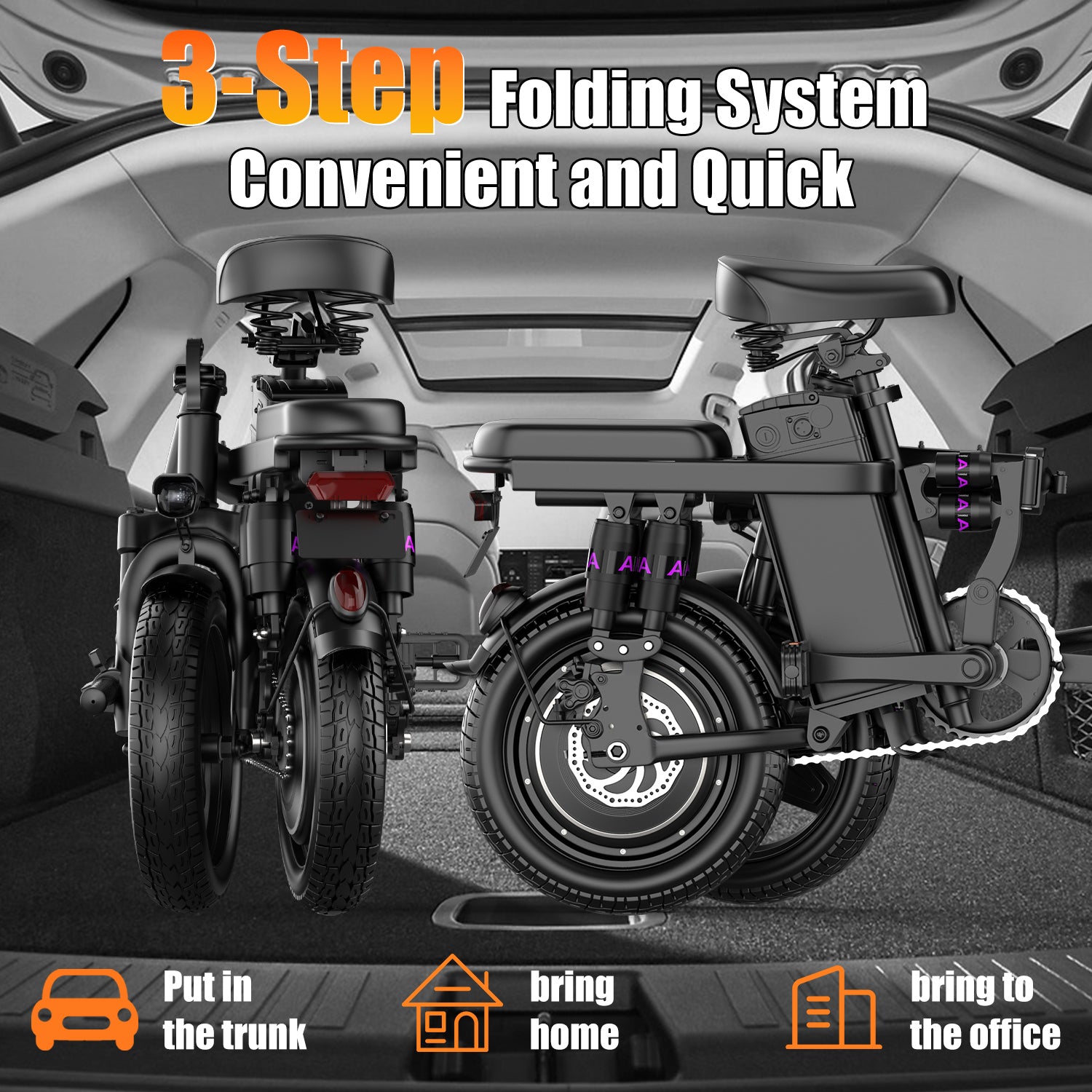 - 【Foldable Design】- The lightweight alloy frame and tightly articulated body give the folding e-bike for adults a simple, spacious and dynamic visual appearance. The quick-foldingmakes it easy to load into the trunk and get in and out of the elevator, displaying mechanical art. Easily maneuver this bike for urban commuting, outdoor, sports and fitness.