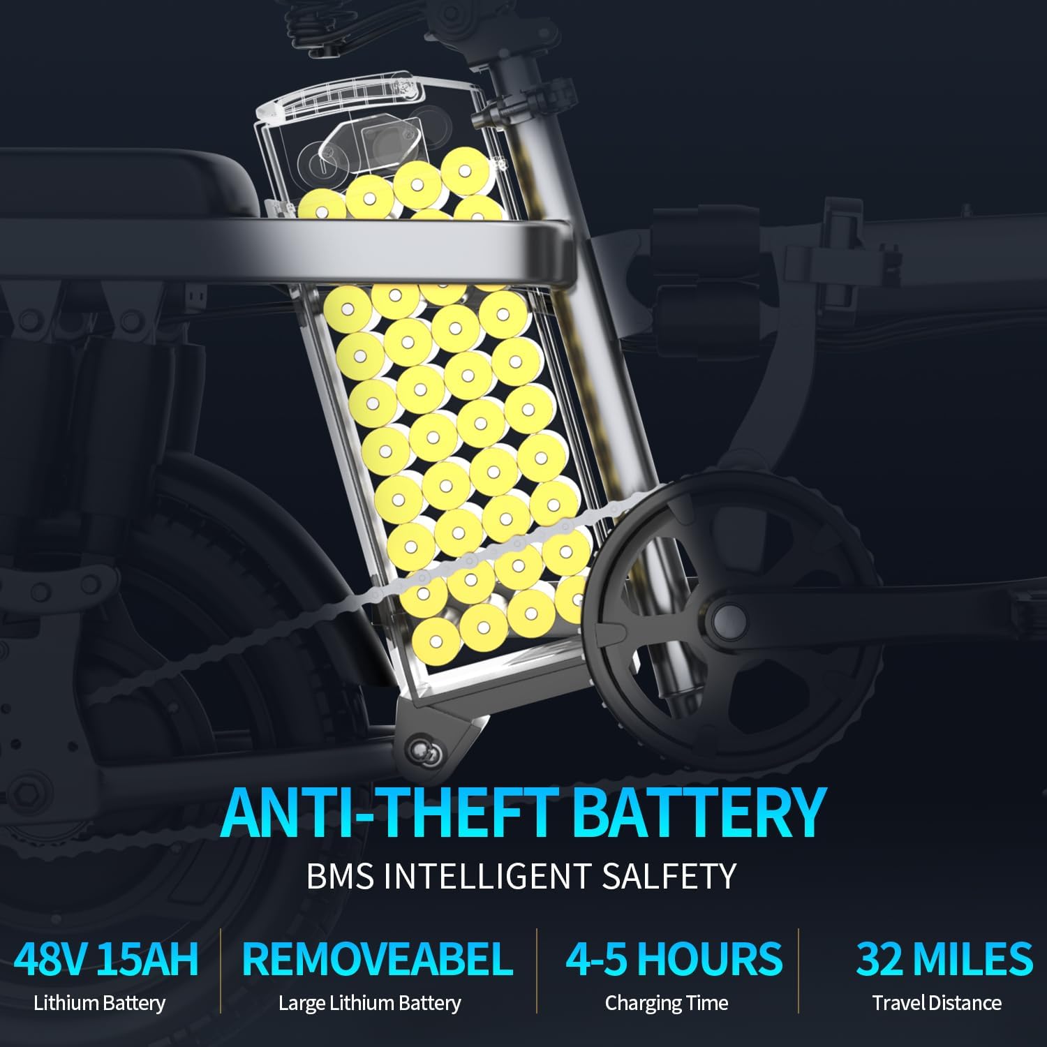 【Durable Battery and Easier Commute】- F9 adult ebike has 48V 13AH removable lithium battery provides a range of 25 miles on a 6-7 hour charge in pure electric mode. If in pedal assist mode, it can travel more than 35 miles. Solve your commuting headaches and reduce fuel bills.